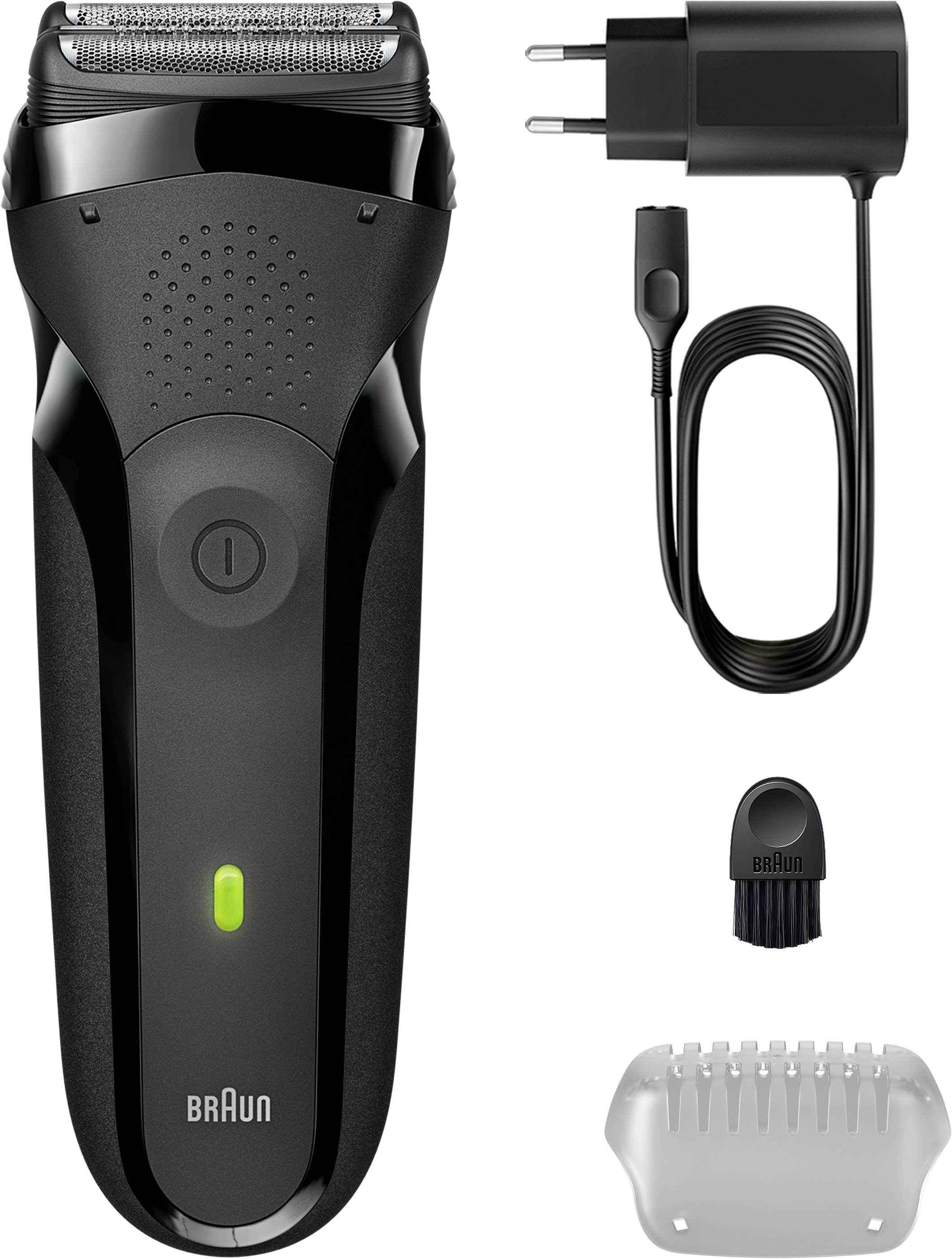 Series 3 borotva, Nyírófej, 1 / 2 mm-es fésű, 3 / 5 /7 mm-es fésű, Védősapka, Tisztítókefe, Töltőkábel