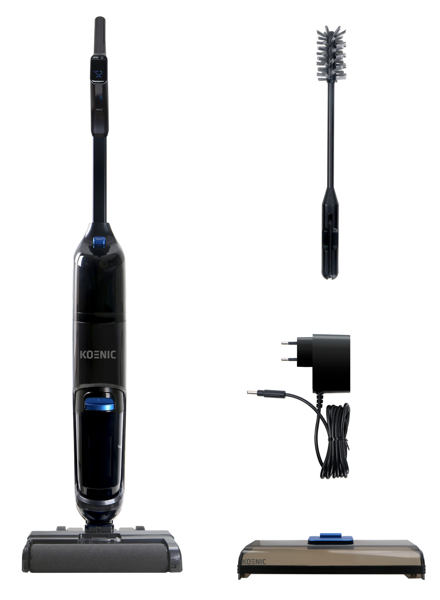 Készülék, használati útmutató, 1x Töltő adapter, 1x Tároló talapzat, 1x Tisztítókefe akasztóval, 1x Használati útmutató, 1x Jótállási jegy