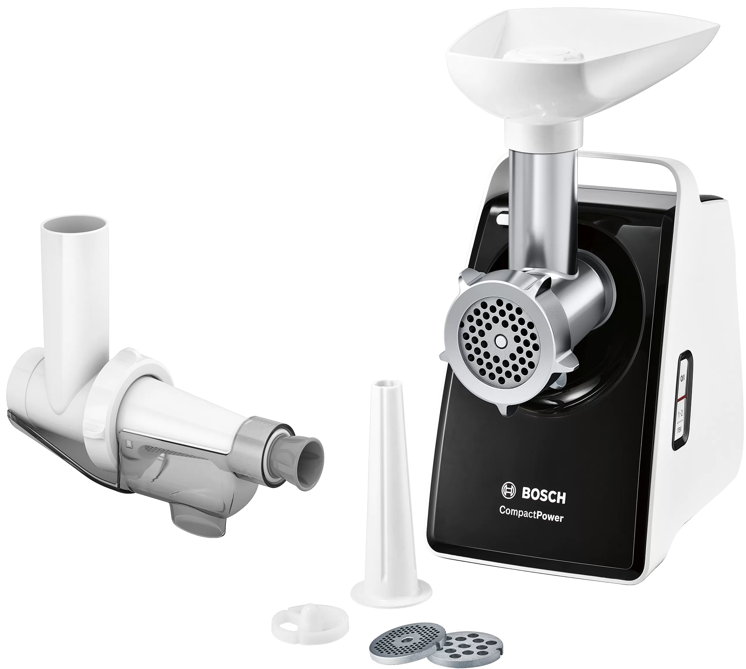 BOSCH MFWS420W Húsdaráló MultiPower S4 1900 W, 2.5 kg/perc darálás, 2 tárcsa, kolbásztöltő, fehér/fekete
