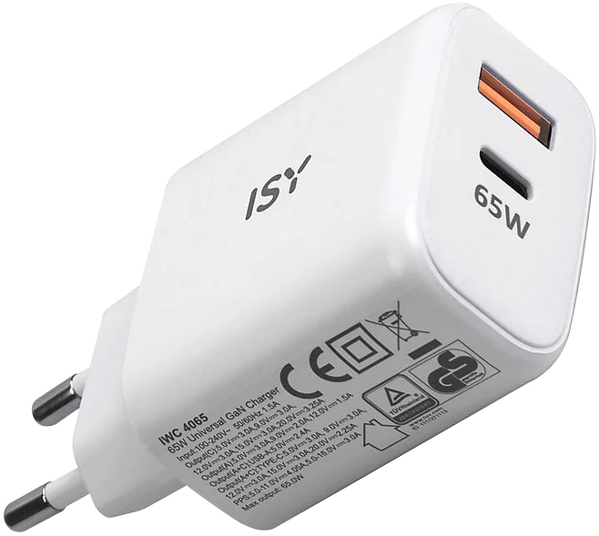 (40 db)ISY IWC 4065 Hálózati töltő adapter, max 65W GaN, USB-A, USB-C, fehér (2V221961)