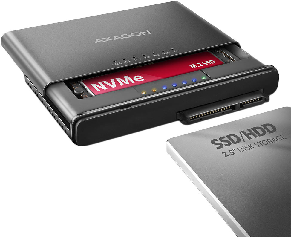 AXAGON USB Type-C 3.2 Gen 2 külső M.2 NVMe SSD ház és SATA dokkoló, klón funkció, fekete (ADSA-CC)
