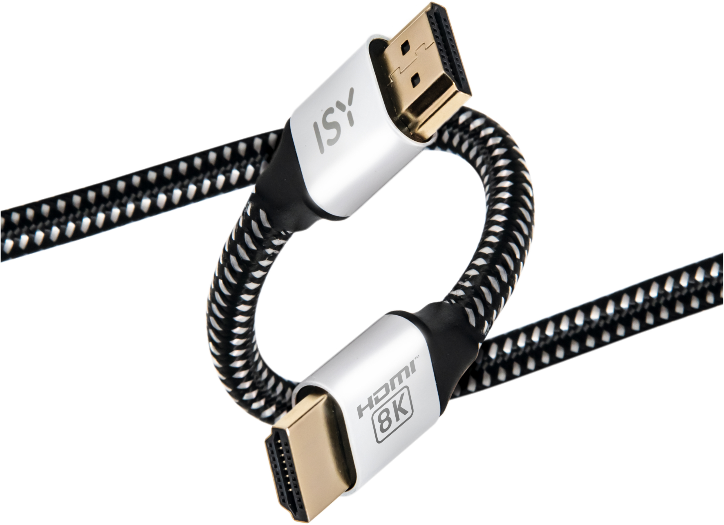(1 db)ISY IHD-5020 HDMI 2.1 összekötő kábel, szövet borítás, max 8K 60Hz, 48 Gbps, 2 méter (2V225511), fekete-fehér